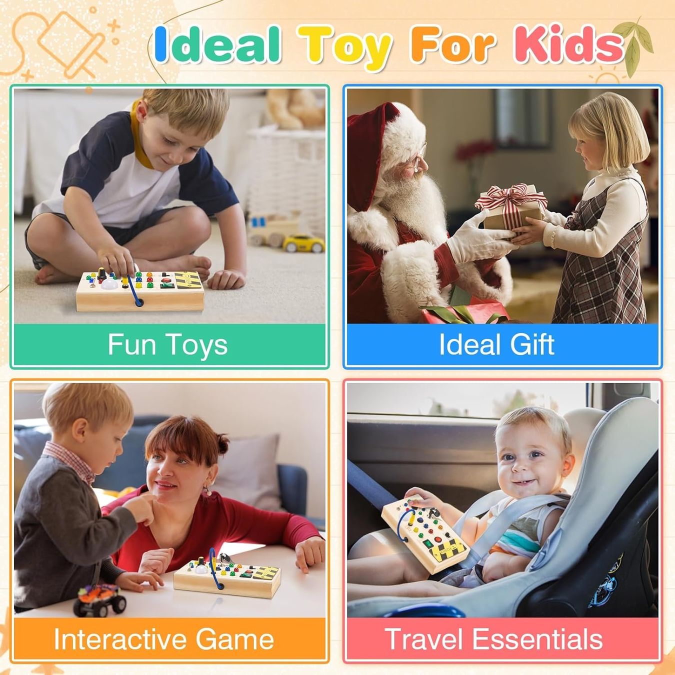 - Frühkindliche Bildung und Lernen: Unser hölzernes Aktivitätsbrett ermöglicht vielfältige sensorische Erfahrungen. Kinder können durch Berühren der Holzelemente, Bedienen von Schaltern und Beobachten von Lichtern die Welt erkunden. Diese Aktivitäten fördern die Wahrnehmungsfähigkeit, kognitive Entwicklung und das praktische Lernen. Kinder lernen auch, Farben zu erkennen und zu differenzieren.