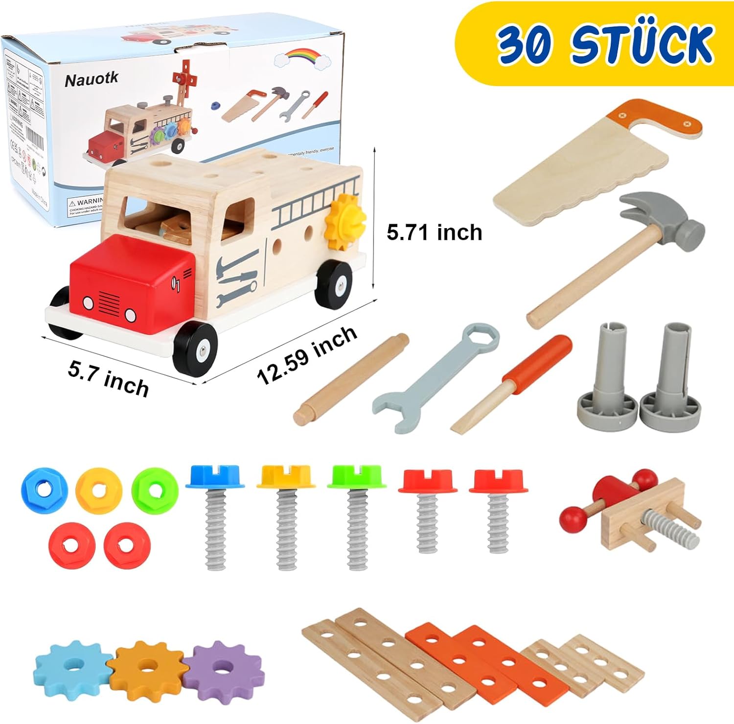 【30-teiliges Holzwerkzeug-Set】Unser Werkzeugset für Kleinkinder beinhaltet 1 x Werkzeugkoffer, 1 x Säge, 1 x Hammer, 1 x Schraubenschlüssel, 1 x Schraubendreher, 1 x Griff, 1 x Drehgriff, 1 x Baustein, 3 x Zahnräder, 5 Schrauben, 2 Nägel, 5 Muttern, 1 Seil und 6 Bauteile. Die lebhaften Farben und die Vielfalt an Holzspielzeug Werkzeugkasten werden Ihrem Kind beim Spielen mit Baumaterialien grosse Freude bereiten.